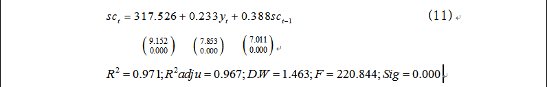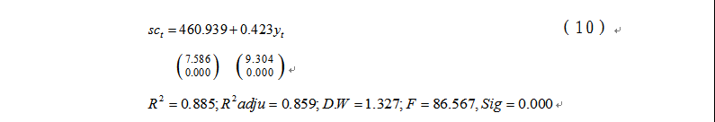 从式(10)知,模型较好地拟合我省1994-2010年间的消费水平与人均GDP水平的关系,模型总显著性检验通过,已不存在序列相关的影响(为排除序列自相关的影响,采取两次迭代回归而通过检验,第一次误差序列回归系数为0.574,第二次误差序列回归系数为0.606),各参数显著性检验也通过。可以用于未来的预测和分析。