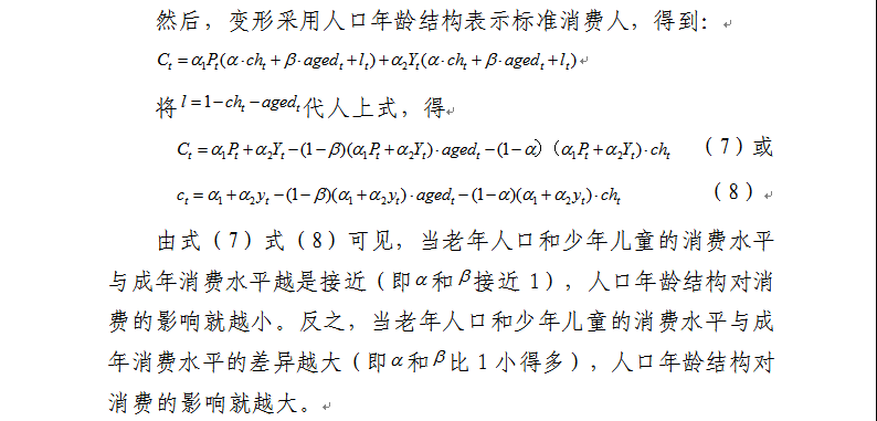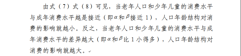 5.老年人口和少年人口的边际消费倾向不仅是与人均收入有关的量,而且与老年人口和少年人口的消费系数有关。从前面的模型知,当老年人口和少年儿童的消费水平与成年人口消费水平越是接近(即α和β接近1),人口年龄结构对消费的负面影响就越小,反之,越大。这提示我们,需要充分挖掘不同年龄层次的消费市场,刺激和满足不同层次的消费需求,促进消费多元化,使得被抚养人的消费水平得到有效提高。