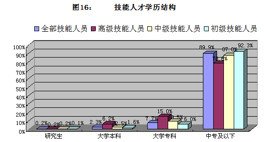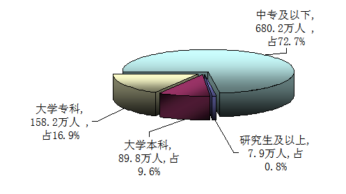 3.技能人才学历层次偏低。技能人才中,具有大学专科及以上学历的仅为53.9万人,占10.1%。其中,高技能人员中也仅占21.4%;初级技能人员中只占7.7%。