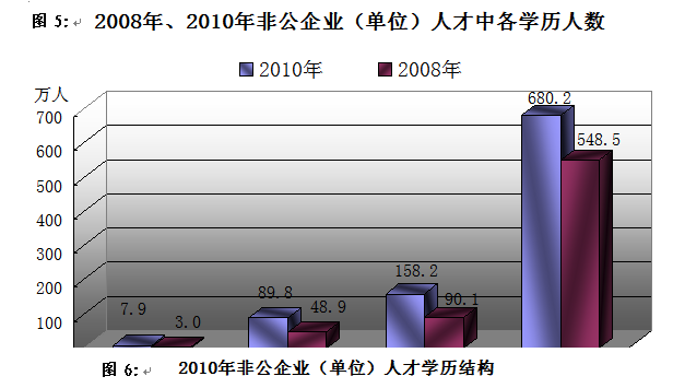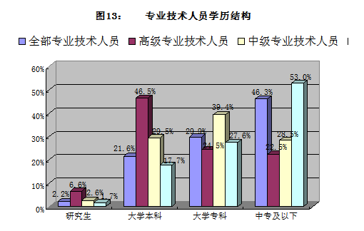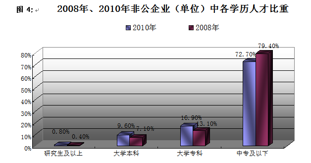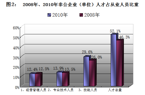 2.人才学历水平大幅提升。非公企业(单位)人才中,具有研究生学历的为7.9万人,比2008年末增加4.9万人,占人才总量的比重为0.8%,比2008年末提高0.4个百分点;具有大学本科学历的为89.8万人,比2008年末增加40.9万人,占人才总量的比重为9.6%,比2008年末提高2.5个百分点;具有大学专科学历的为158.2万人,比2008年末增加68.1万人,占人才总量的比重为16.9%,比2008年末提高3.8个百分点。专业技术人员、技能人员中具有国家评定的专业技术职称、技能等级(业资格证书)的人员比重大幅提高,分别比2008年末提高5.4个百分点和20.2个百分点。人才总体素质提升显著。
