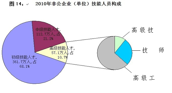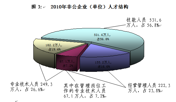 1.高技能人才比重偏低。2010年底,全省非公企业(单位)技能人才为531.6万人。其中,高级技能人才为57.1万人,占非公企业(单位)技能人才总量的10.7%;中级技能人才为112.7万人,占21.2%;初级技能人才361.7万人,占68.1%。高技能人才仅占年末从业人员的3.2%,高技能人才比重偏低。