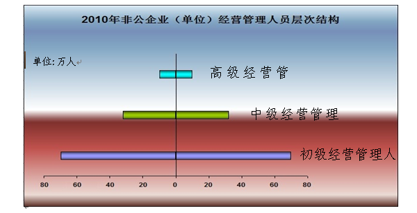 1.高级经营管理人才比例不高。根据非公企业(单位)人才调查,2010年底,全省非公企业(单位)经营管理人才为222.3万人,其层次结构大致呈金字塔型,其中居塔顶的高级经营管理人员为19.5万人,占经营管理人员的8.8%;居中间的中级经营管理人员为63.6万人,占28.8%;居底层的初级经营管理人员为139.1万人,占62.6%。高级经营管理人员作为企业的领导、决策核心,是企业竞争力、开拓创新能力的塑造者和推动者,仅占年末从业人员的1.1%,占经营管理人员的8.8%,比例不高。