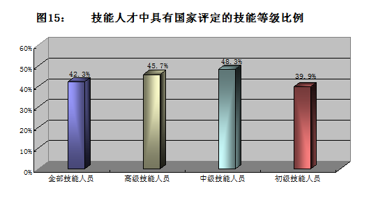2.技能人员中拥有国家评定的技能等级比例低。非公企业(单位)技能人员中,仅有42.3%的人拥有国家评定的技能等级。即使是高级技能人才中,也只有45.7%的人拥有国家评定的技能等级。技能人才中拥有国家评定的技能等级比例偏低。