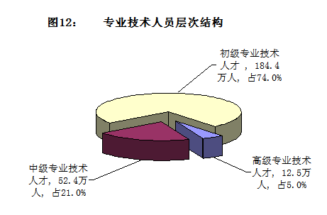 1.高级专业技术人才比例低。2010年底,全省非公企业(单位)专业技术人才为249.3万人。其中,高级专业技术人才为12.5万人,占非公企业(单位)专业技术人才总量的5.0%;中级专业技术人才为52.4万人,占21.0%;初级专业技术人才为184.4万人,占74.0%。高级专业技术人才仅占年末从业人员的0.7%,比重偏低,不利于企业的持续发展和竞争力的提升。