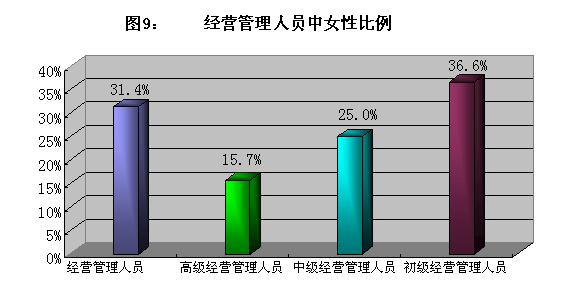 2.女性高级经营管理人才少。非公企业(单位)经营管理人才中,女性不多,为69.9万人,占31.4%。且随着经营管理人员层次的上升,女性比例递减,在高级经营管理人员中仅为15.7%,远低于初级经营管理人员中36.6%的水平。