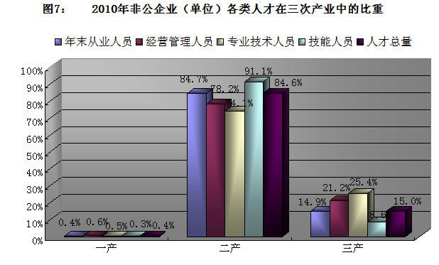 3.人才分布日渐合理。调查初步推算数据显示,非公企业(单位)三次产业的从业人员比例为0.4%、84.7%和14.9%,人才在三次产业的比例为0.4%、84.6%和15.0%,两者比例基本一致,其中三产人才比重比2008年末上升5.6个百分点。制造业、建筑业等传统劳动密集型行业仍是吸纳人才的主要产业,占人才总量的84.2%。教育业,水利、环境和公共设施管理业,科学研究、技术服务与地质勘查业,交通运输、仓储和邮政业等行业人才量比2008年末有了快速增长,增幅居前。人才总体分布均匀,日渐合理。