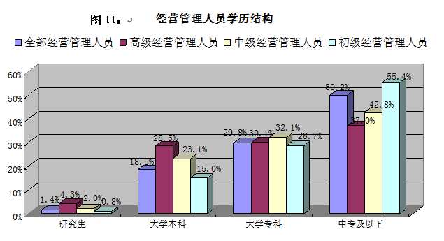 4.学历结构中中专及以下人员比重过高。非公企业(单位)中大学专科及以上经营管理人员占49.8%,中专及以下占50.2%。大学专科及以上经营管理人员比例随经营管理人员层次的上升而递增,高级管理人员中这一人员比例达到了63.0%,但是初级管理人员中仅为44.6%。尤其值得注意的是,在高级经营管理人员中有37.0%仅有中专及以下学历,这是不利于企业培养核心竞争力,参与国际竞争,融入世界经济的。