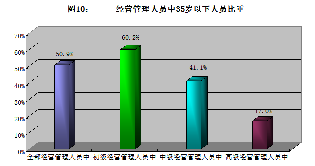 3.高级经营管理人员年龄结构偏大。非公企业(单位)中35岁以下经营管理人员为113.2万人,占50.9%,总体年龄结构较为合理。但年轻经营管理人员比重随经营管理人员层次提高而降低,尤其是在高级经营管理人员中的比重仅为17.0%。这不利于企业的开拓创新,也不利于企业经营的稳定性和延续性。