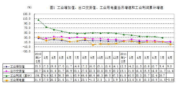 2.工业生产、出口、利润和用电量增速继续趋缓。8月份,规模以上工业增加值947.6亿元,比去年同期增长9%,增速比上月回落0.4个百分点(见图1),增速自3月份开始逐月回落,7、8月份出现加速回落迹象,其中,轻、重工业分别增长8.4%和9.5%,增速分别比上月回落0.2和0.5个百分点;出口交货值977.9亿元,同比增长11.4%,增速比7月份回落0.3个百分点,比销售产值低7.1个百分点,出口拉动销售产值增长仅2.5个百分点。7月份,企业利润246.3亿元,仅增长10.7%,比6月大幅回落16.1个百分点。