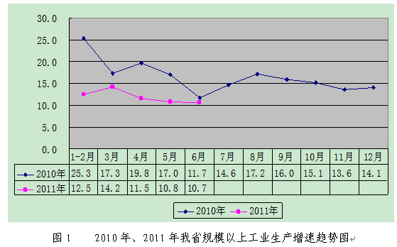 从运行态势看,我省规模以上工业生产增速由1-2月的12.5%小幅回升到3月的14.2%后,回落到4月的11.5%、5月的10.8%和6月的10.7%(见图1);由一季度的12.9%回落至二季度的11.0%。6月份,中国物流与采购联合会发布的中国制造业采购经理指数(PMI)为50.9%,连续3个月回落,与我省工业生产增速变动情况吻合。初看6月生产增速比5月仅减缓0.1个百分点,但基于去年6月生产增速比5月快速回落5.3个百分点,去年7月、8月生产增速又逐步提高,工业增速回落态势得到遏制可能性不大,继续下行概率较大。