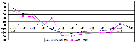 7.商品房销售负增长。2010年下半年,我省商品房销售明显回落,并且出现连续负增长的局面,今年1-2月转降为升,一季度再次出现下降。一季度,全省商品房销售面积890万平方米,同比下降5.5%。其中,住宅、办公楼、商业营业用房销售面积均出现下降,降幅分别为4.0%、14.0%和20.7%。一季度,全省商品房销售额增长13.2%,比1-2月回落8.9个百分点。