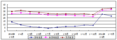4.民间投资快速增长,国有投资增速略有回落。一季度,全省非国有投资增长32.3%,比1-2月提高1.2个百分点,其中民间投资增速为34.4%,比1-2月提高1.0个百分点;国有投资增长22.5%,比1-2月回落3.0个百分点。非国有投资增速比国有要快9.8个百分点。