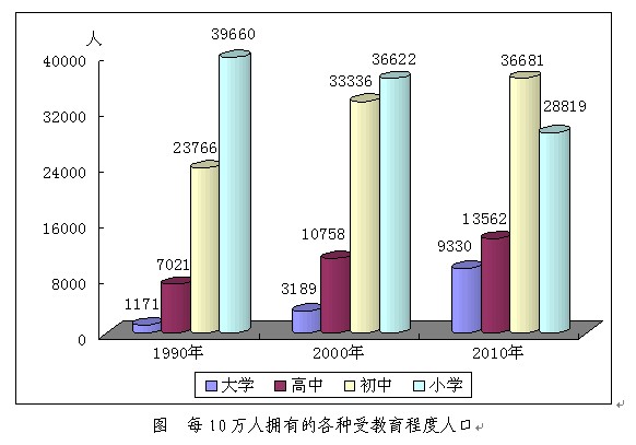 人口受教育状况是反映人口文化素质的一项重要内容。据浙江省第六次人口普查,2010年,全省受教育程度明显提升,人口文化素质稳步提高。全省常住人口中,具有大学(指大专以上)程度的人口为507.78万人;具有高中(含中专)程度的人口为738.12万人;具有初中程度的人口为1996.41万人;具有小学程度的人口为1568.54万人。与2000年相比,每10万人中具有大学、高中、初中程度的人数分别增加了6140人、2804人和3345人,而小学程度和未上过学的人口则相应的减少了7802人、4486人。与全国相比,每10万人中具有大学程度的人口从2000年的比全国少422人,增加到2010年的比全国多400人。从年龄上看,年轻人口的受教育程度提高更为明显。在15-29周岁的人口中,具有高中及以上受教育程度的比重达到51.1%,比2000年的29.1%提高了22.0个百分点。这说明浙江省普及高中段教育已初具成效,高等教育也逐步从精英教育迈入大众化教育阶段。