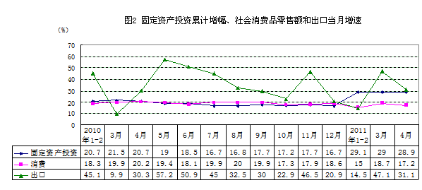 2.投资增长较快。1-4月,全省固定资产投资3495.4亿元,比去年同期增长28.9%,增速与一季度基本持平(见图2)。施工项目22490个,同比增长15.6%,其中新开工项目5538个,增长14.7%,新开工项目计划总投资增长45.3%。从投资主体看,国有控股投资增长26.3%;非国有投资增长30.1%,占投资总额的比重从去年同期的67.7%上升到68.3%,其中,民间投资增长31.6%。从投资领域看,一产投资增长3.4%;二产投资增长22%,工业投资增长20.7%,工业技术改造投资增长18.7%,占工业投资的55.6%,制造业投资1211.4亿元,增长20.7%,装备制造业投资573.3亿元,增长27.2%;三产投资2073.5亿元,增长34.2%,增速分别比固定资产投资总额和二产投资高5.3和12.2个百分点,所占比重达59.3%。房地产开发投资1073.1亿元,增长45.4%,增速比一季度加快2.1个百分点,新开工面积和购置土地面积等部分先行指标增长较快,分别增长59.8%和54%。商品房销售面积和销售额全面下降,比去年同期分别下降19.3%和7%,降幅分别比一季度扩大13.8和20.2个百分点,其中,90平米以下住宅销售面积下降9.3%。