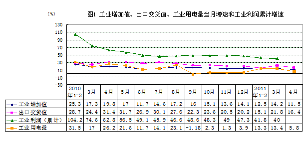1.工业生产、出口和用电量增速有所趋缓。4月份,规模以上工业增加值为896.1亿元,比去年同期增长11.5%;出口交货值919.6亿元,增长16.4%,增速分别比3月回落2.7和5.4个百分点(见图1)。1-4月,工业增加值3176.0亿元,增长12.4%;出口交货值3189.4亿元,增长17.0%,增速均比一季度回落0.5个百分点。4月份,全社会用电量254.4亿千瓦时,同比增长7.3%,其中工业用电量200.4亿千瓦时,增长5.8%,增速分别比3月份回落7.9和7.6个百分点。1-4月,全社会和工业用电量分别增长12.6%和11.1%。