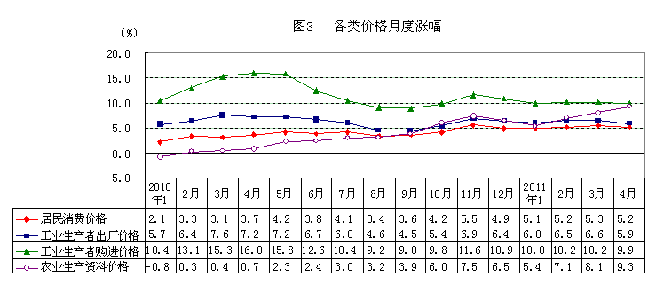 4月份,工业生产者出厂价格和购进价格同比分别上涨5.9%和9.9%,涨幅比3月份分别回落0.7和0.3个百分点(见图3),两项价格环比分别上涨0.4%和0.9%,环比涨幅比3月份回落0.4个百分点。15个工业部门出厂价格同比全面上涨,建材工业涨幅居首,上涨16.3%,其次为石油工业,上涨15.8%,煤炭及炼焦工业上涨10.2%,纺织工业上涨10.1%,化学工业上涨10.0%,其他部门涨幅都在10%以内。9大类原材料购进价格同比全面上涨,纺织原料类涨幅居首,上涨14.8%,化工原料类、农副产品类、有色金属类分别上涨14.1%、13.2%和12.4%,其他类别涨幅都在10%以内。1-4月,工业生产者出厂价格和购进价格同比分别上涨6.2%和10.1%,出厂价格涨幅比一季度回落0.2个百分点,购进价格涨幅与一季度持平。