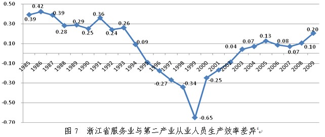 从上图可以看出,1985-1994年及2003-2009年这两个阶段服务业生产效率高于第二产业,特别是2003年以后这种趋势开始明朗化,两个产业生产效率逐渐拉大,2003年差距仅为0.04,2008年增加到0.10,2009年继续扩大到0.20。