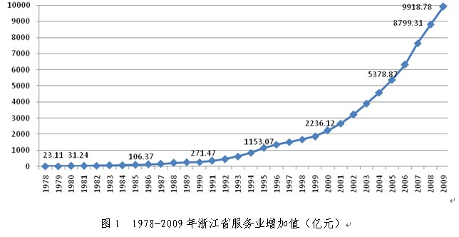 改革开放以来,浙江服务业的发展大致可分为三个阶段:1978-1990年,这一阶段浙江经济发展的重点在第二产业,服务业处于一个缓慢积累的过程当中,绝对数很小,1978年仅为23.1亿元,1990年仍仅有271.5亿元,年均增长12.6%;上世纪90年代为服务业发展的第二阶段,服务业总量快速扩大,服务业增加值从1991年的350亿元快速扩大到2000年的2236.1亿元,年均增长15.3%;新世纪以来,随着工业化城市化的不断推进,服务业也迎来了一个发展的高潮,其总量已经逐渐接近第二产业增加值,从2001年的2665.7亿元增加到2009年的9918.8亿元,年均增长13.7%。
