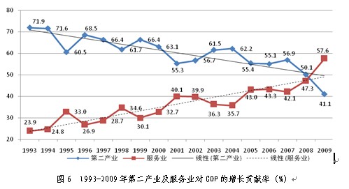 1.服务业是国民经济增长的源泉之一。服务业对GDP增长的贡献率越来越高。1993年,浙江服务业对GDP增长的贡献率为23.9%,2000年提高到32.7%,2009年更是高达57.6%,也是1993年以来浙江服务业对GDP增长的贡献率首次超过第二产业(见图6)。
