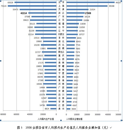 5.人均服务业增加值居省区第一。2008年,浙江人均服务业增加值17308元,在全国排第四位,比经济总量居前三的广东、江苏、山东省分别高出1182元、2212元和6258元,居省区第一(见图5)。