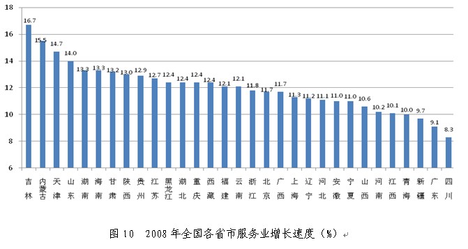 从全国看,浙江服务业发展速度也有所减弱。2008年,浙江省服务业增长11.8%,在全国位居17位,比前三位的吉林、内蒙古、天津分别低4.9、3.7、2.9个百分点,比与我省服务业发展程度较接近的山东、江苏省分别低2.2、0.9个百分点(见图10)。
