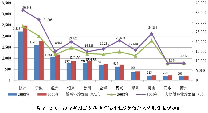 从上图中可以看出,各市服务业发展差距较大。2008年,服务业增加值前三位的杭州、宁波、温州分别是最小的衢州市的11倍、8倍、5.3倍,人均服务业增加值前三位的杭州、宁波、舟山分别是最小的丽水市的3.1倍、2.6倍、2.3倍。2009年,杭州、宁波、温州三市的服务业增加值分别是最小的衢州市的11.2倍、8.1倍、5.3倍,人均服务业增加值前三位的杭州、宁波、舟山分别是最小的丽水市的4.2倍、3.6倍、2.8倍,差距进一步扩大。