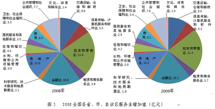 以金融业为代表的新兴服务业发展迅猛。2007年金融业增加值占服务业增加值的比重为16.4%,2009年上升到%19.1,提高2.7个百分点。传统服务业所占份额有所下降。2009年,批发和零售业增加值占服务业的比重为21.4%,较2008年下降0.2个百分点;交通运输、仓储和邮政业比重为9.0%,较2008年下降0.6个百分点(见图3)。