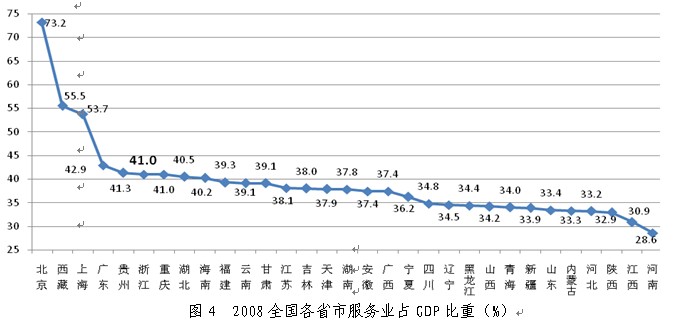 2008年,我国各省市服务业占GDP比重前六位的依次是北京、西藏、上海、广东、贵州和浙江,其中北京和上海是直辖市,有着经济、政治、文化、区位、历史等多方面的优势,排名靠前实属必然。西藏和贵州两省的经济规模较小,工业化水平低,他们的服务业比重这一数据代表性不强。广东、江苏、山东及浙江四个省份经济总量大,同居全国前列,有较强可比性,浙江服务业比重较江苏和山东两省分别高出2.9个百分点和7.6个百分点,比广东省低1.9个百分点,可见,浙江服务业总体发展水平在经济较为发达省份中处于前列。
