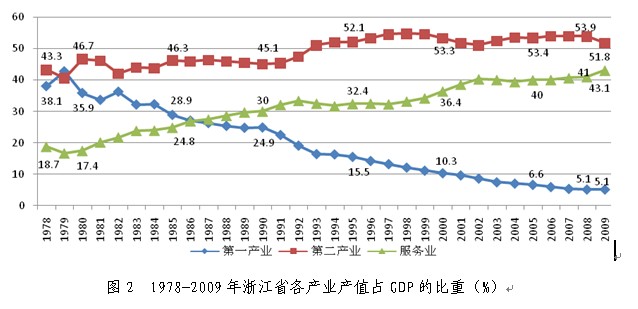 改革开放以来 ,浙江第一产业在生产总值中的比重不断下降,而第二产业及服务业所占比重则不断上升。1978年,浙江服务业增加值所占比重仅为18.7%,1990年为30%,2009年提高到43.1%。同时,服务业增加值和第二产业增加值的差距也不断减小,1978年两者占当年生产总值比重的差距为24.6个百分点,1990年为15.1个百分点,2000年缩小为16.9个百分点,到2009年两者的差距已缩小到8.7个百分点。毫无疑问,随着经济的蓬勃发展,这种差距仍将进一步缩小。