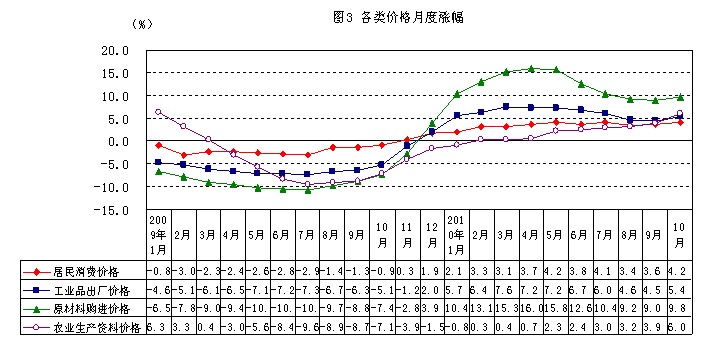 1-10月,全省居民消费价格比去年同期上涨3.6%,涨幅比1-9月提高0.1个百分点,商品零售价格同比上涨3.7%,农业生产资料价格同比上涨2.1%。