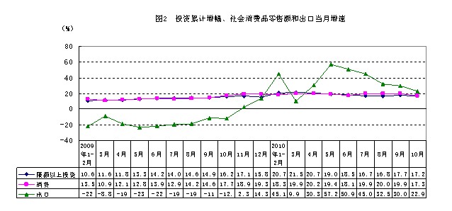 10月份,社会消费品零售总额为919.5亿元,比去年同期增长17.3%(见图2),比9月回落2.6个百分点,其中,城镇市场零售额806.3亿元,增长17.3%,乡村零售额113.2亿元,增长17.6%。分行业看,批发和零售业分别增长19.5%和17%,住宿和餐饮业分别增长15.5%和18.5%。从限额以上贸易企业分类商品零售额看,节日消费特点明显,服装鞋帽针纺织品、金银珠宝、通讯器材类增长较快,分别增长40.8%、63.4%、39.4%,日用品、家用电器和音像器材类增长平稳(14%和7.4%)。汽车销售增幅回落,10月份销售145.5亿元,比去年同期增长28.6%,拉动全社会消费品零售总额增长4.1个百分点,但同比增速比9月回落4.8个百分点,环比下降9.4%(9月同口径为160.6亿元);石油及制品类同比增长29.7%。1-10月,社会消费品零售总额8222.8亿元,同比增长19.1%,扣除价格因素,实际增长14.9%,名义和实际增速分别比1-9月回落0.3和0.2个百分点。