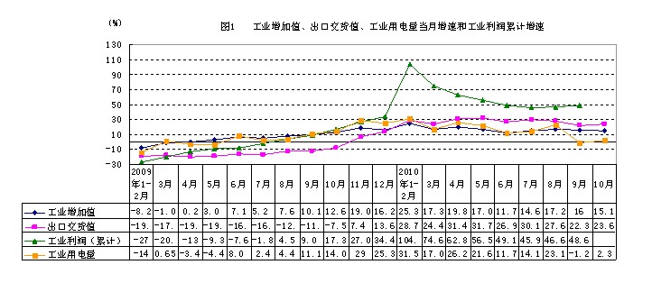 10月份,规模以上工业增加值为915亿元,比去年同期增长15.1%(见图1),增速比9月份回落0.9个百分点,其中,轻、重工业增加值分别为391.9和523.1亿元,均增长15.1%,增速分别比9月份回落1.7和0.3个百分点。出口交货值928亿元,增长23.6%,增速比9月加快1.3个百分点。1-10月,工业增加值8268.9亿元,增长17.2%,出口交货值8585.1亿元,增长29.1%,增速均比1-9月回落0.3个百分点。