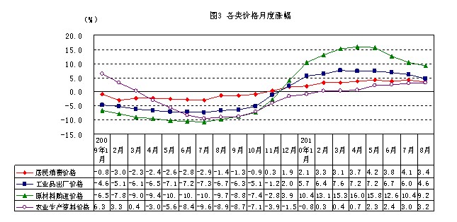 7.CPI、PPI和房价同比均有所回落,环比略有上涨。8月份,居民消费价格比去年同期上涨3.4%(见图3),涨幅比7月份回落0.7个百分点,连续7个月超过3%,环比上涨0.4%,与全国同期相比,我省居民消费价格同比和环比涨幅分别低0.1和0.2个百分点。所调查的八大类价格七涨一降,涨幅较高的是食品、居住、医疗保健等类,同比分别上涨6.2%、6.1%、4.2%,娱乐教育文化用品及服务、烟酒、家庭设备用品及维修服务、交通和通信等类价格分别上涨3%、0.9%、0.5%和0.1%,衣着类价格下降2.5%。粮食价格连续19个月上涨,并且连续7个月达到两位数上涨,但涨幅趋缓,为13.7%,比7月份回落1.4个百分点;猪肉价格上涨5.7%,涨幅比7月份回落1.3个百分点;油脂价格转降为升,8月份上涨1.2%(7月为下降0.8%)。