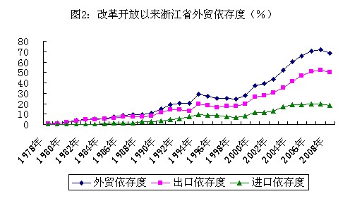 1.外贸作用日益突出。改革开放以前,由于受国民经济发展影响和高度集中统一的体制制约,当时浙江的对外贸易形式十分单一,进出口规模很小。改革开放以后,作为全国最早实行对外开放的省份之一的浙江充分利用国家对外贸易政策的调整机遇,立足省情,发挥优势,不断适应对外开放的新形势,对外贸易持续快速发展,进出口贸易总量迅速扩大,在全国贸易总量的比重不断提高,贸易额排名稳步提升,对外贸易己成为浙江经济持续稳定发展和产业结构不断升级优化的重要引擎。1978年,浙江进出口贸易规模只有0.7亿美元,其中,出口仅0.52亿美元。2008年,全省进出口总值和出口值分别达到2111.09亿美元和1542.67亿美元,1979-2008年浙江进出口总值年均增长30.6%,超过同期GDP年均增幅(按现价计算)11.8个百分点,其中出口值年均增长30.5%。出口额在全国的位次由1978年的第11位上升到2008年的第4位,出口占全国出口额的比重由1978年的0.5%上升到10.8%。对外贸易的快速增长为国民经济的发展提供了强有力的支持,2008年,全省外贸依存度(进出口总值相当于全省生产总值的比率)和出口依存度(出口总值相当于全省生产总值的比率)分别达到了68.2%和49.9%,分别比1980年提高66.1和47.9个百分点。