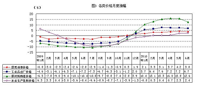2.PPI同比高位走平,环比首次下降。上半年,工业品出厂价格和原材料购进价格同比分别上涨6.8%和13.8%,比一季度分别上升0.2和0.9个百分点,其中,3、4月份两项价格涨幅分别达最高点(见图3),之后开始逐步回落。6月份环比分别下降0.4%和0.9%,是自2009年4月份以来首次下降。从15个工业部门的工业品出厂价格累计同比涨幅看,石油工业涨幅居首,上涨26.8%,冶金和化学工业分别上涨19.8%和11.3%。从9大类原材料购进价格累计同比涨幅看,有色金属类居首,上涨34%,燃料动力、化工原料类价格分别上涨18.9%和14%。