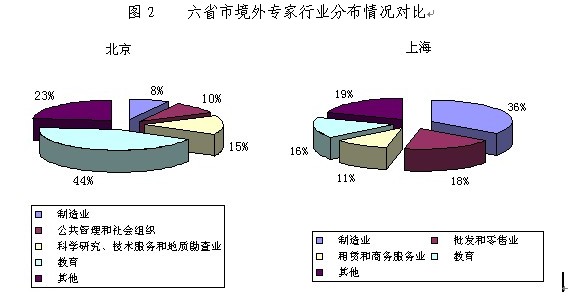 就行业分布情况而言,为方便图示对比,特将各省市占比最大的前4位行业列出,其他一并归入“其他”。北京市境外专家行业分布以教育行业所占比重最大,高达44%,其次是科学研究、技术服务和地质勘查业(15%)、公共管理和社会组织(10%)、制造业(8%),显然,第三产业境外专家人次比重远远高于第二产业。上海市境外专家行业分布以制造业所占比重最大(36%),而后为批发和零售业(18%)、教育(16%)、租赁和商务服务业(11%)。根据图2可以清晰地看到,江苏、山东、浙江、广东四省的境外专家行业分布有一个共性,即比重最大的前2位行业均为制造业、教育。再进一步分析,可以看到,江苏、山东、广东三省的制造业所占比重非常之大,均超过60%,而浙江、上海的制造业比重均低于50%,与北京一样,第三产业境外专家人次高于第二产业。