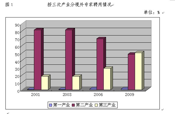 浙江“十一五”引进国外智力规划中重点指出,要加快先进制造业基地建设、积极支持第三产业发展,发展壮大支柱产业,大力开展引进国外人才智力工作。在政策的引导下,浙江引智工作卓有成效,第三产业境外专家的聘用人次所占比重已从2001年的18.2%上升到2009年的50.3%(如图1所示)。
