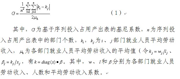 对收入分配差距程度的度量有很多指标。本文利用基于序列投入占用产出表的基尼系数方法对各部门就业人员劳动收入分配差距进行测度,公式为: