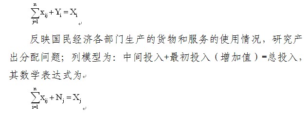 从投入产出表横向和纵向出发,可以分别建立数学模型来进行产业关联的各种分析。行模型为:中间使用+最终使用=总产出,其数学表达式为