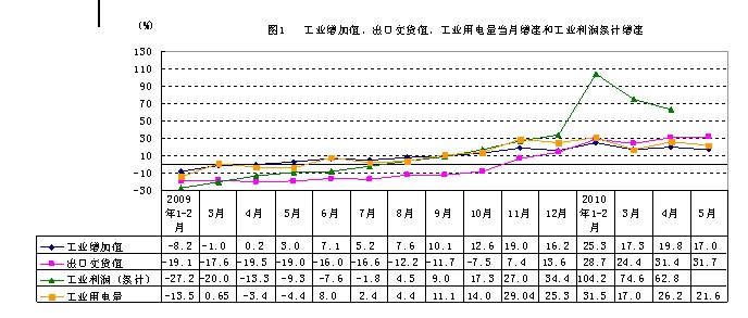 1.工业生产和用电增速略有回落,出口增长继续加快。5月份,规模以上工业增加值为847.5亿元,比去年同期增长17%(见图1),增速比4月份回落2.8个百分点,比全国同期高0.5个百分点。其中,轻、重工业增加值分别为355.1和492.4亿元,分别增长13.4%和19.7%,增速均比4月份回落2.8个百分点。出口交货值884.6亿元,增长31.7%,增速比4月加快0.3个百分点,比销售产值高2.6个百分点,出口拉动销售产值增长6.7个百分点。1-5月,工业增加值3694.3亿元,增长20.6%,增速比1-4月回落1个百分点,比全国高2.1个百分点;出口交货值3810.4亿元,增长29.1%,增速比1-4月加快0.8个百分点,比全国高1.4个百分点。5月份,全社会用电量235.4亿千瓦时,同比增长20.7%,其中工业用电量190.4亿千瓦时,增长21.6%,增速分别比4月回落3.7和4.6个百分点。1-5月,全社会和工业用电量分别增长22.8%和24.6%。