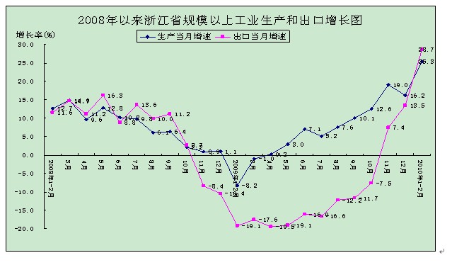 从走势看,我省规模以上工业生产增长速度于2009年1-2月到达最低点,为-8.2%,3月开始反转向上运行,4月份实现正增长,此后短期高点不断被刷新。今年1-2月,25.3%的较高增速再创2008年以来新高,月度生产增速基本筑成“V”型反弹图形(见图1)。