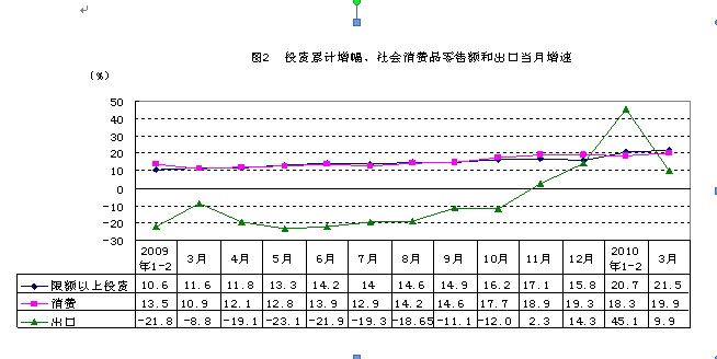1.投资继续保持较快增长。一季度,全社会固定资产投资1972.1亿元,比去年同期增长20.5%,增速分别比去年同期和四季度加快9.8和3.5个百分点,其中,限额以上固定资产投资1870.6亿元,增长21.5%,增速分别比去年同期和四季度加快9.9和3.6个百分点,与2008年同期相比,全社会和限额以上投资两年年均分别增长15.5%和16.4%,快于“十一五”前三年同期年均增长12.9%和12.1%的增速。扣除投资价格上涨因素,全社会和限额以上投资分别增长17.9%和18.9%,实际增速同比加快5.2和5.3个百分点,比去年全年回落1.2和0.8个百分点。在限额以上投资中,第二产业投资增长14.8%,其中制造业增长20.6%;第三产业投资增长27.2%;第一产业投资下降2.9%。从投资领域看,基础设施投资增速明显回落,房地产投资和销售较快增长。基础设施投资482亿元,增长8.4%,增速比去年同期回落25.1个百分点,其中电力投资下降12.9%。房地产投资增长加快,销售增速略有回落。房地产开发投资500.5亿元,增长30.3%,增速分别比去年同期和今年1-2月分别加快25.5和5.1个百分点,商品房销售面积和销售额分别增长31.3%和68.3%,比1-2月回落15和20.9个百分点。本年购置土地面积同比增长93.4%,改变了去年负增长的局面。