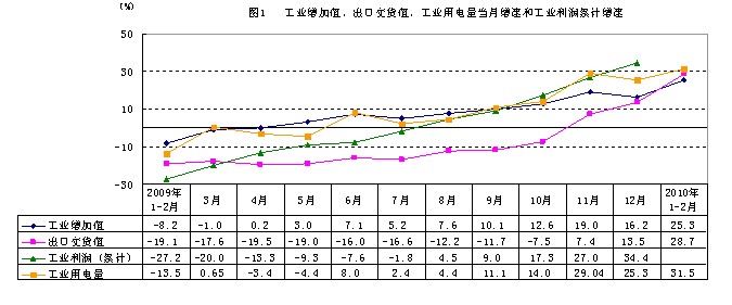 1.工业生产、出口和用电量在去年同期下降的基础上增幅较高,新产品产值率继续提高。1-2月,规模以上工业增加值为1260.9亿元,比去年同期增长25.3%,增幅比去年12月和去年同期分别提高9.1和33.5个百分点(见图1),比全国平均水平高4.6个百分点。今年的较高增幅是在去年同期大幅下降(-8.2%)的基础上实现的,据测算,今年1-2月与2008年同期相比,年均增长8%左右,增速仍在正常范围之内。由于去年是前低后高的走势,今年又是工业结构调整的关键一年,因此,今年生产增速可能前高后低。轻、重工业增加值分别增长18.5%和31.3%,延续了去年9月以来重工业生产增速快于轻工业的趋势,增幅差进一步拉开到12.8个百分点。装备制造业增加值421.9亿元,同比增长34.5%,比规上工业增加值平均增速高9.2个百分点。出口交货值为1305.2亿元,同比增长28.7%,增幅比去年12月和去年同期分别提高15.2和47.8个百分点,累计增幅首次转降为升。企业开工状况总体良好,在已纳入统计的59704家规模以上工业企业中,1-2月未开工的只有159家,且基本为季节性生产企业。新产品产值率继续提高。1-2月全省规模以上工业新产品产值1022.8亿元,同比增长44.5%,新产品产值率16.5%,比去年同期提高0.8个百分点。工业用电量较快增长。1-2月,全社会用电量373.8亿千瓦时,同比增长27.3%,其中工业用电量269.2亿千瓦时,增长31.5%,而去年同期均为下降,工业用电量增速明显高于工业生产增速,将对后期节能减排产生较大压力。