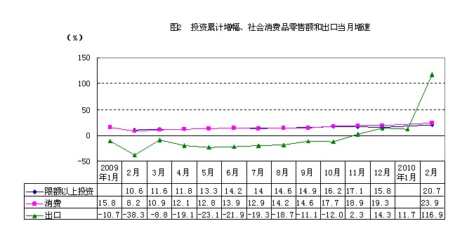 2.投资继续保持较快增长。1-2月,全省限额以上固定资产投资953.6亿元,比去年同期增长20.7%,增幅比去年同期和全年分别提高10.1和4.9个百分点,比全国城镇固定资产投资增幅低5.9个百分点。去年新开工项目增势较好,这些项目的续建对投资增长的作用有所增强,今年新开工项目较多。1-2月施工项目15911个,其中新开工项目1688个,同比分别增长9.2%和32.6%,新开工项目计划总投资增长23.7%。从限额以上投资的行业看,一产投资3.25亿元,同比增长13.6%;二产投资376亿元,增长11.9%,工业投资增长12.3%,工业技术改造投资增长10%,占工业投资的51.5%,以非国有投资为主的制造业投资318.8亿元,增长18.9%,30个制造业行业中有21个行业投资增长,其中,纺织、皮革、木材加工、家具、石油加工、橡胶制品、黑色金属加工、工艺品制造业等8个行业增幅超过30%,装备制造业投资145.5亿元,增长15.3%;三产投资574.3亿元,增长27.3%,高于限额以上投资平均增幅,占限额以上投资的比重为60.2%,明显高于去年全年比重(56.1%)。其中,住宿和餐饮(49.8%)、金融(70.3%)、科研服务(443.2%)、文化体育和娱乐(70.2%)、居民服务和其他服务业(276.4%)等服务业投资增长较快。从投资领域看,基础设施投资增速明显回落,房地产投资和销售较快增长。基础设施投资同比增长6.3%,增幅比去年同期回落25.5个百分点,其中比重达21.5%的电力投资下降16.3%。房地产开发投资272.6亿元,增长25.2%,商品房销售面积和销售额分别增长46.3%和89.2%。本年购置土地面积同比增长60.7%,改变了去年以来持续负增长的局面。