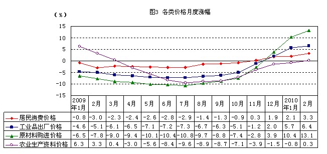 PPI继续快速上涨。1-2月,工业品出厂价格和原材料购进价格同比分别上涨6%和11.7%,分别比全国平均涨幅高1.1和2.6个百分点。其中,2月份两项价格分别上涨6.4%和13.1%(见图3),2月份涨幅比1月份提高0.7和3.2个百分点;1-2月累计进出价差扩大到5.7个百分点,比全国(4.2%)高1.5个百分点。环比分别上涨0.4%和0.7%,已连续11个月上涨。从15个工业部门的工业品出厂价格累计同比涨幅看,石油工业涨幅居首,上涨22.2%,其次为冶金工业,上涨20.9%,化学工业上涨11.8%,其他都在4.6%以内,缝纫、皮革和文教艺术工业用品分别下降0.8%、0.9%和1.2%。从9大类原材料购进价格累计同比涨速看,有色金属涨幅居首,上涨38%,燃料动力类受国际原油价格上涨影响上涨15.7%,化工原料上涨13.3%。农业生产资料价格转降为升,2月份同比上涨0.3%(1月份同比下降0.8%),但1-2月累计同比仍下降0.2%。