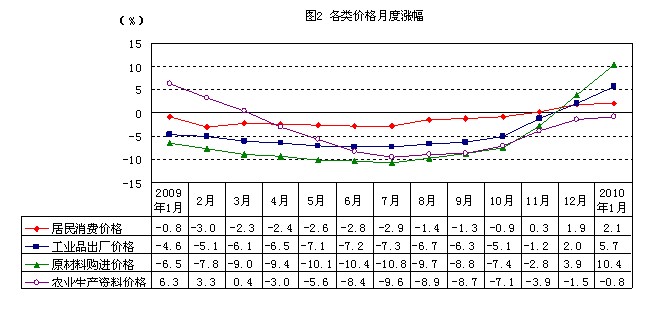 分别上涨5.7%和10.4%(见图2),涨幅分别比12月份提高3.7和6.5个百分点;进出价差扩大到3.7个百分点。环比分别上涨1.1%和1.9%,已连续10个月上涨。从15个工业部门的工业品出厂价格同比涨幅看,冶金工业涨幅居首,上涨21.6%,其次为石油工业,上涨18.8%,化学工业上涨11.2%,其他都在3.5%以内,缝纫和皮革分别下降0.8%和1.1%。从9大类原材料购进价格同比涨速看,有色金属涨幅居首,上涨37%,燃料动力类受国际原油价格上涨影响上涨13.2%,化工原料上涨12.8%。农业生产资料价格同比仍下0.8%,环比上涨0.5%。