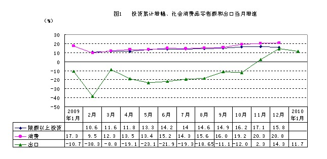 财政收入快速增长,支出下降。1月份,财政一般预算总收入590.3亿元,其中地方一般预算收入327.5亿元,同比分别增长24.1%和23.7%,增幅比去年同期提高32.8和29.2个百分点。在地方一般预算收入中,营业税、企业所得税和个人所得税同比分别增长20.6%、49.8%和19.6%,增值税下降1.1%。地方财政一般预算支出167.1亿元,同比下降13%,去年为应对金融危机,中央实施扩内需政策,资金自1月起陆续到位,因而去年的基数较高。在财政支出中,医疗卫生、社会保障和就业、交通运输支出分别增长2.8%、27.6%和28.3%,其余各项支出同比均为下降。