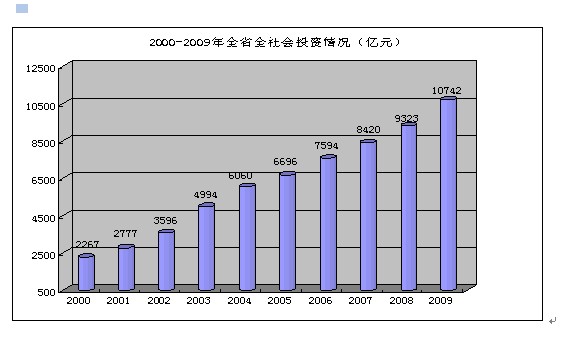 1.全社会投资突破万亿。2009年,浙江全社会固定资产投资突破1万亿元,达到10742亿元(见下图),列江苏、山东、广东、辽宁、河南、河北、四川后,居全国各省市区第8位。