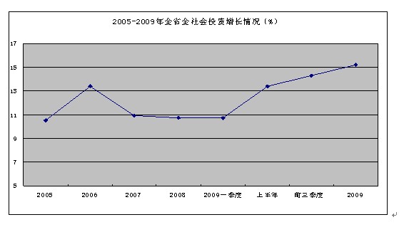 2.增幅创近5年来最好水平。进入2009年,为克服金融危机带来的种种不利影响,我省坚决贯彻实施中央扩大内需项目投资,及时推出政府主导项目投资计划,在国有投资的主导与带动下,全省投资稳中加快。2009年,全省全社会投资比上年增长15.2%,创近5年来的最好水平(见下图),增幅比上年提高4.5个百分点。