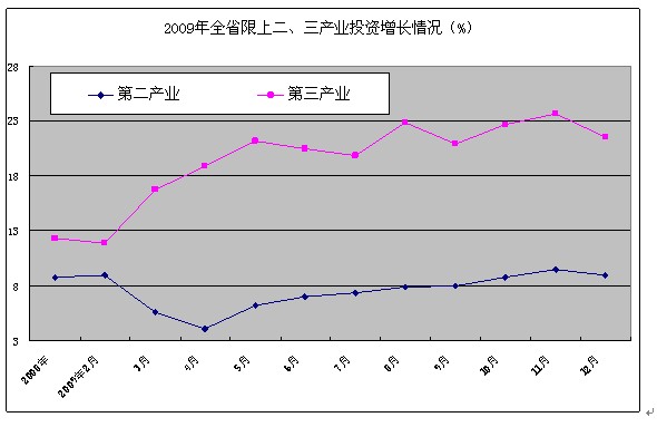 2.第一产业投资增长快、波动也大。2009年,全省限额以上第一产业投资57.5亿元,增长59.3%,增幅比上年提高50.8个百分点。从全年各月情况看,第一产业投资增幅经历了低开、走高再回落的过程,月度之间波动比较大,最低为1-2月仅增长7.8%,最高为1-6月增长93.2%,两者相差85.4个百分点。